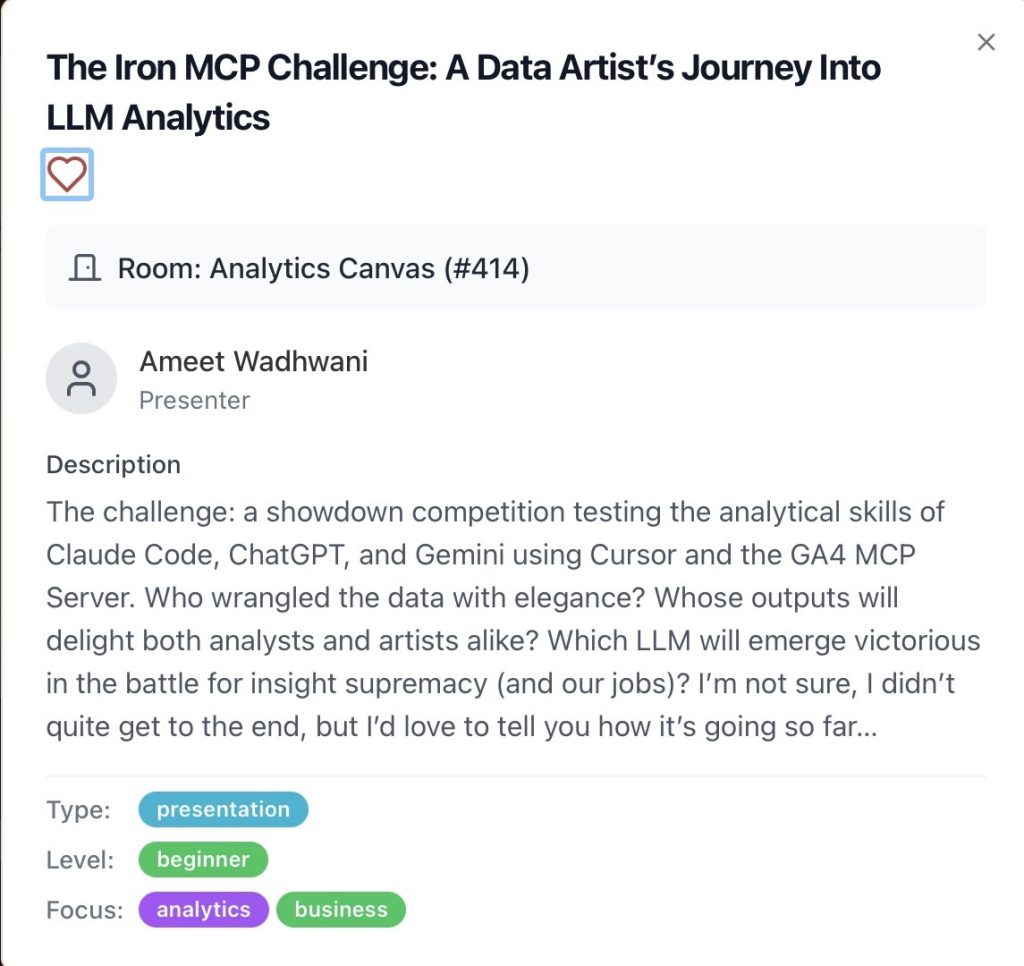 Later, I attended a follow-up tactical session comparing the performance across multiple LLMs, run by Ameet. The session was the first time I saw someone actually using GA4 MCP server to perform analysis tasks. Kudos to Ameet for having the courage to do a live demo in front of a packed room of audience! Judging by the size of the audience, it is apparent that this is how the industry is moving forward (or that is what the buzz is about).