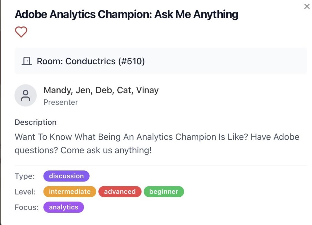 This AMA(ask me anything) session highlighted 5 “adobe analytics champions”. They are not employed by Adobe, instead they are nominated for their evangelizing efforts and contribution to the broader Adobe analytics community – primarily writing content and answering questions in a website called “experience league” hosted by Adobe.